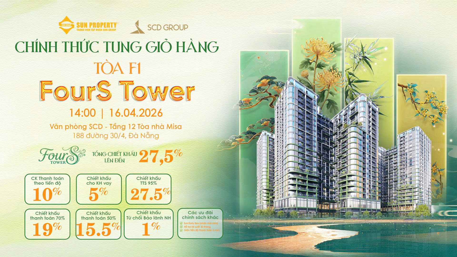 FourS Tower – Dự án HOT nhất thị trường hiện nay! Sun Group chính thức ra mắt chính sách bán hàng SUN EARLY KEY, mang đến cơ hội vàng cho nhà đầu tư sở hữu căn hộ Hòa Xuân Đà Nẵng. Thanh toán linh hoạt, khai thác trước, sở hữu lâu dài – bước đi thông minh để tối đa hóa lợi nhuận ngay từ giai đoạn đầu.